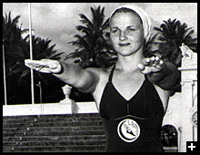 “Pat—she has a lot of guts, and she crashed,” Lee said of her painful flops during practices. “Pat was not a natural diver. She had to work at it.”2 Lee underestimated McCormick’s determination and her relentless work ethic. McCormick was a wonder from an early age, having strongmen in Los Angeles’s Muscle Beach flip her up in the air where she would perform her acrobatics. There is a picture of her when she was no more than 10 years old holding up a well-built man who is standing on her shoulders, with well-defined muscles popping from her little arms and shoulders. She spent her youth at the beach and in the water, sometimes daring to jump off bridges.