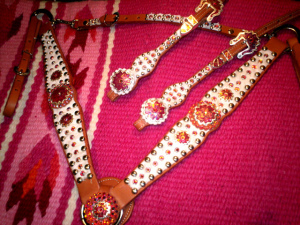 Renee’ Bearss’ Cowboy Couture tack line flashes everything from brindle hides to exotic stingray, with bling of every color to match. My personal favorite is her red zebra striped stingray, but 90 percent of what Renee’ makes is a customer order, so...more
