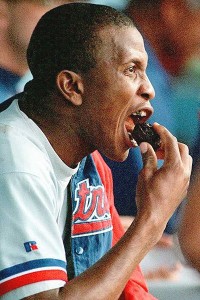 Carlos Perez attempts to chew the Montreal Expos to victory