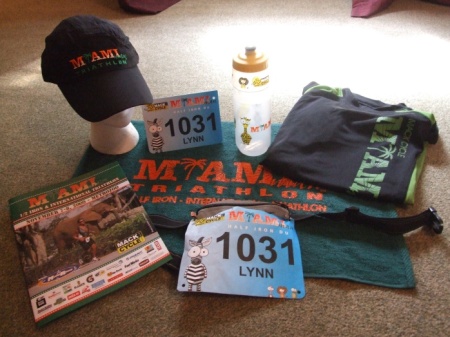 Above: Swag from 2009 Miami Man. You can see my race number attached to my race belt in the bottom of the photo. The race towel is the perfect size to use to set up all your gear in your transition area.