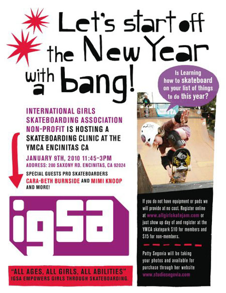 International Girls Skateboarding Association is holding a girls skateboard clinic this weekend at YMCA Encinitas 11:45 – 3:00. All ages, all girls, all abilities. Special guests include pro skateboards Cara Beth Burnside and Mimi Knoop.