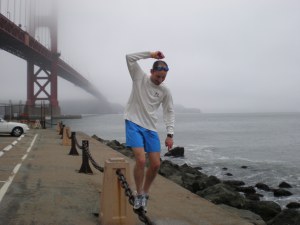 As we approached the beach, we could see the landmark even through the fog. To our left was the Golden Gate Bridge — our scenery and destination for our morning run.