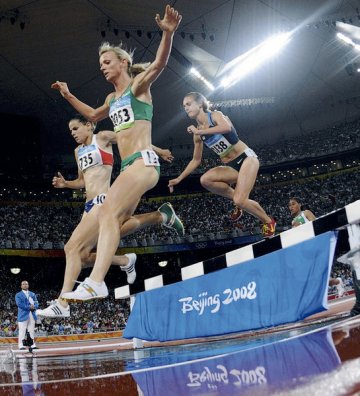 It threatened to thunderstorm all day and was generally warm and humid all weekend, but it cooled off a bit and the sun set behind the trees just enough to be out of the women's eyes coming over the water barrier in the New Balance Women's Steeplechase at...more