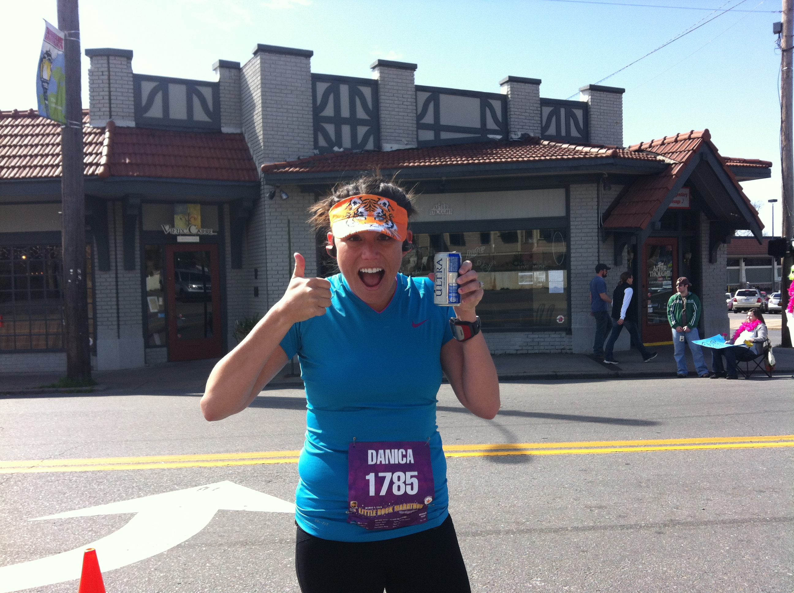 Tara and I ran the whole race together. It was really a nice start, we headed out to the Clinton Library and around the downtown area and over the river on a bridge. It was really a nice day. One thing I noticed, and it might be my job critique coming out in me was that there was throwaway clothes ALL THROUGHOUT THE ENTIRE COURSE. Like everywhere, I haven’t ever seen so many throwaways at mile 6. It didn’t make sense to me. But that was interesting and I know it must stink for them cleaning that all up. We checked off the miles, drank our water every mile and at mile 6, I ate my first sandwich square. There were so many people out along the course, so much spectator participation, which I loved. I love it when people take part in the race and make it special for the runners and the Little Rock community really made a huge impact along the course. There were so many stations out there that communities had set up their on their own with a huge array of snacks, drinks, and just people out cheering and enjoying the race. I will never forget how many people were out there and EXCITED to be out there. That made a huge difference.