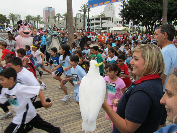 When Saturday morning hit I knew I wouldn’t be snuggling back into my bed until late Sunday night. It was really hard to get out of bed and get going but I was still very nervous about the weekend. First up was the kids run at the Aquarium of the Pacific. We’ve been working with them since I came on board for the kids run and I knew it was going to be awesome. There was so many things going for the run and by August we had doubled our numbers from the previous year. We were giving out medals and finishers certificates to each finisher and the medals were ADORABLE.