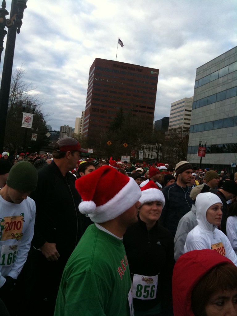 This past Sunday, I got the opportunity to run my first race out of state at the Portland Jingle Bell 5k! It was a very well organized small race that was an out and back along the water front in Portland. I wore a long sleeve Nike shirt underneath my jacket and long Lucy pants. I was really nervous that I would be too cold, but I wasn’t at all! I also wore my Monkey Beanie to the start line, but traded it in for my North Face headband/ear warmers for the run as the beanie would have gotten too hot. I also made sure to wear my Adidas running gloves because I didn’t want my fingers to get too cold.