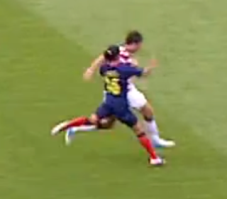A few minutes later Rapinoe was flying up the wing with the ball. Lady Andrade struggled to get ahead of Wambach, who was racing up the middle. Incredibly, Andrade reached around Wambach with a hook to the face. Deliberate foul.