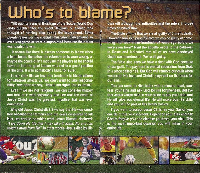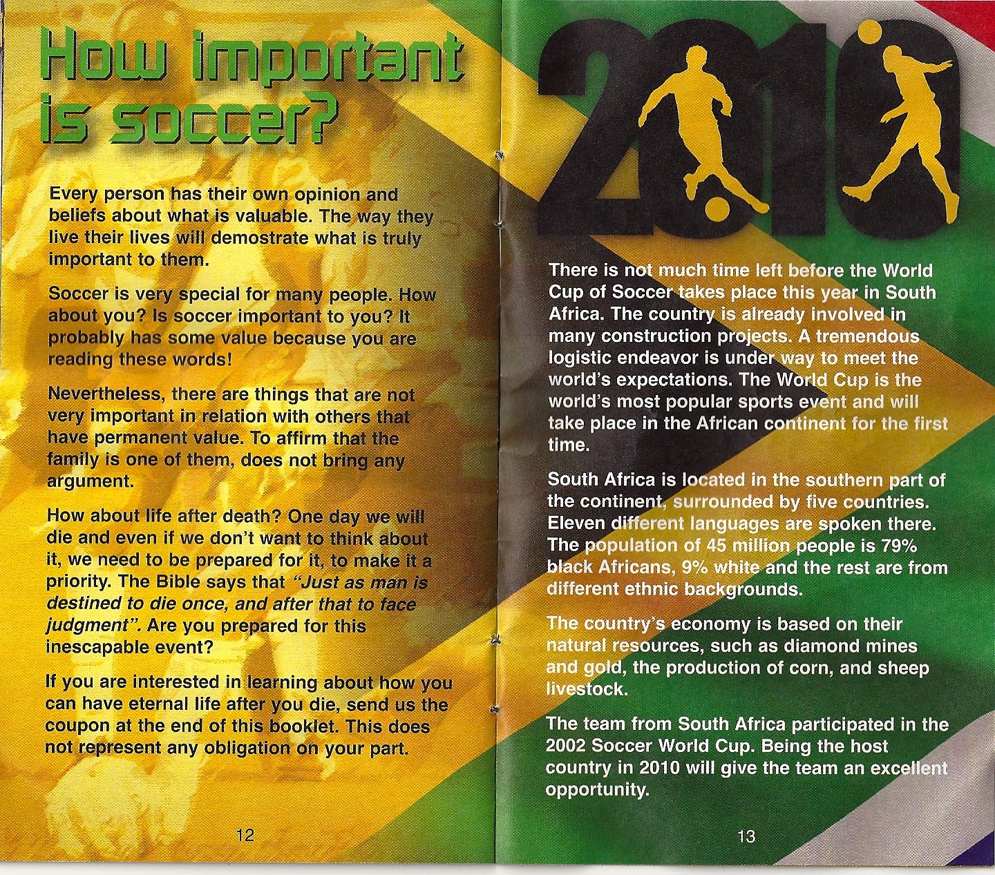 My favorite World Cup ephemera is this brochure, produced for a "Bible Correspondence Course" in Long Beach, CA. A friend of mine found it on his car windshield, a couple weeks before the tournament's start.