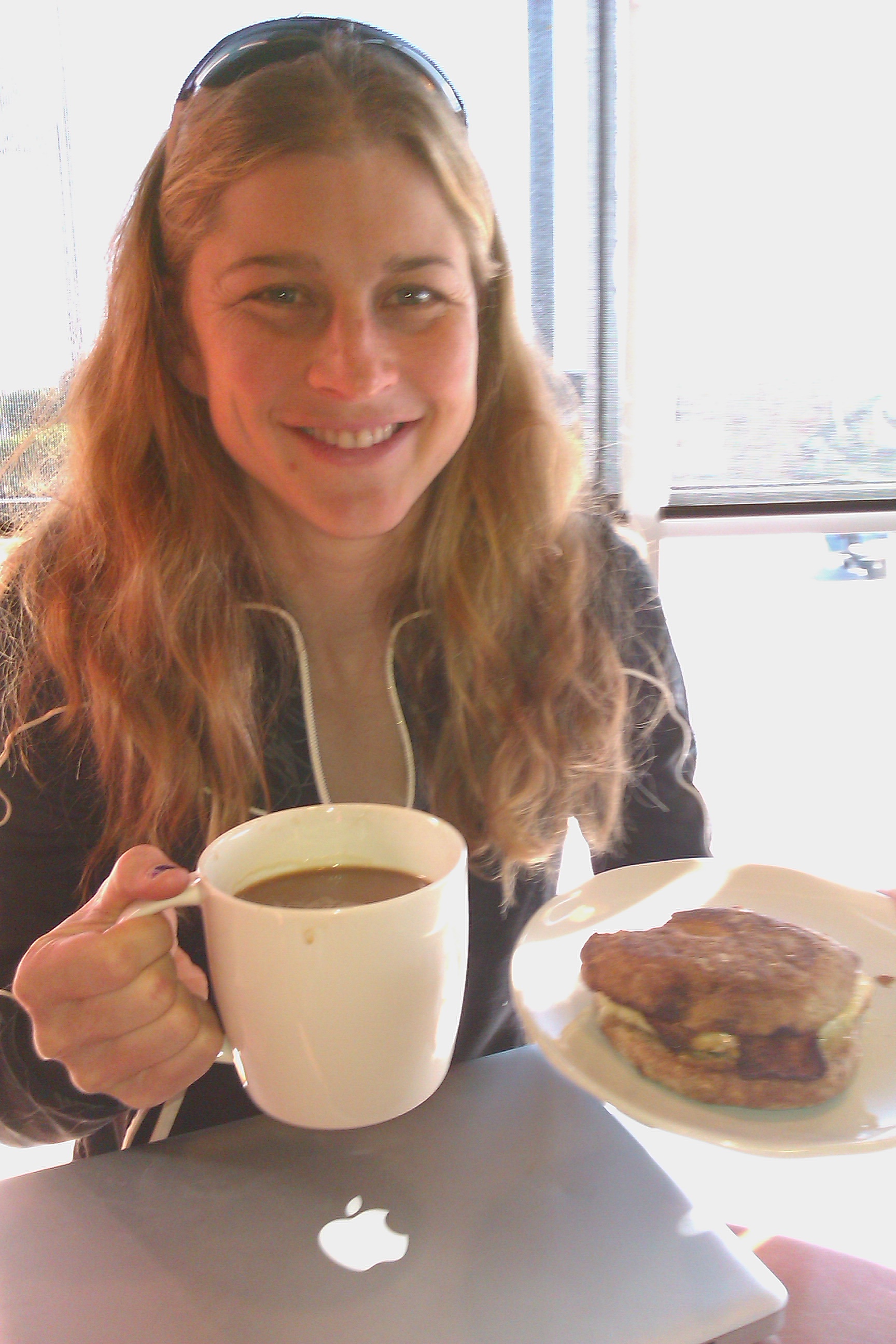 My morning workout breakfast in a pinch. Breakfast sandwich and coffee from Starbucks. (Photo courtesy of Alicia Shay this morning!)