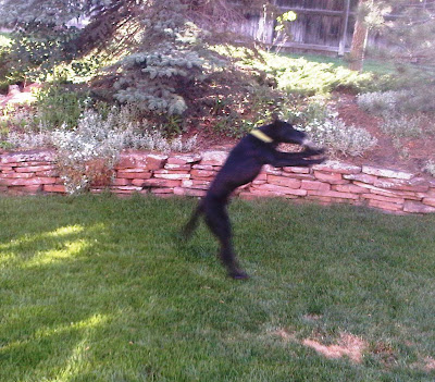 For a long time I would not chase a ball. But then, it was really windy every day for a long time and my Frisbee wouldn’t fly in the air very well. One windy day, Deep Voice threw me a ball and I went after it. I had no choice; I needed to run after something. Oh my goodness, it was much more fun than I thought it would be! Deep Voice got this funny looking object to throw the ball and it goes really far, almost across the park. Then Deep Voice got this bright orange ball that bounces really high. I can jump in the air like I do with my Frisbee, or I can chase after it at full speed.
