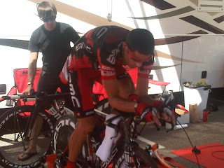 It was interesting to look at the different bike set ups and bike positions. Most riders opted for a TT bike with a disc wheel. Some, however used a road bike with clip on aero bars and other chose a road bike without aero bars. While everyone did use some type of aero wheel, there was a wide variety in the wheel choice from somewhat aero to very aero. I mostly saw guys wearing aero helmets, but there were a few that used a traditional helmet.The bike positions were also very disparate. Some of the guys had atrocious positions and were moving all over the saddle. Other were clearly much more comfortable on a TT bike and looked smooth.