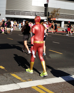 The most important race feature though? Porta potties. They were everywhere. Thousands of them lined up like soldiers. No matter which way you turned, there were porta potties waiting for users, and not the usual lines of racers hopping impatiently from foot to foot looking at their watches, wondering why the person in the bathroom is taking so damn long (seriously, though, what does take so long? Reading the paper?).