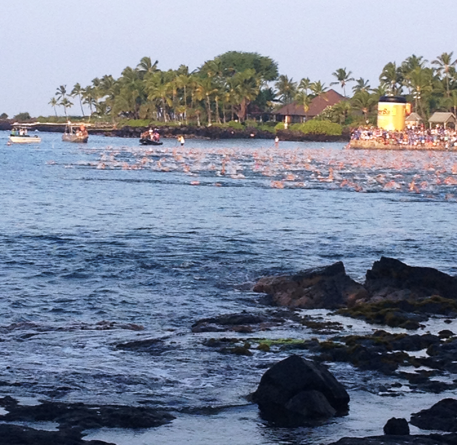 And they're off!Ironman is not a spectator sport. I know I am stating the obvious, but, wow, it just isn't. Like many sports events, it is the palpable excitement of being there that draws people in, even when such an event is better watched on TV. The most action was in the first 90 minutes where we saw three separate swim starts (pro men, pro women, age groupers), the swim itself, and then the droves of people precariously rounding the Hot Corner (the junction of Palani Rd and Kuakini Hwy) and back again. The riders zoomed by so quickly it was somewhat of a game to pick out who they were.