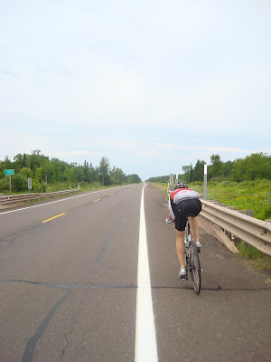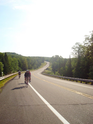 On Friday morning, we loaded up the Durango (Amy would be meeting us that evening in Hurley and was Diane's partner for the relay) and headed off on our bikes. It was a lot of climb climb climb, descend descend descend, not in that particular order. The roads were great, though. I absolutely love the route along M-26 from Atlantic Mine toward Ontonagon. It's great pavement, typically not too much traffic, and rolling hills with great scenery. The trees kind of canopy the road. Just outside Toivola, along a beautiful stretch of highway, a deer popped out of the woods and ran along side of us. It was a little unnerving not know when he'd want to cross the road, but we gave him space and the little guy jumped across the highway. We flew down the hills just east of M38, but once traffic started picking up a little more (there seemed to be a lot of RVs out there this weekend), things got a little more hairy.
