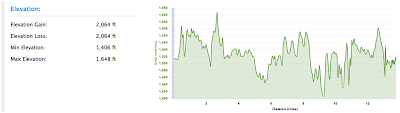 After I wrapped the chip around my ankle, I took off and headed through the rolling hills. I felt good the whole race. There were a few climbs that seemed to keep going, but nothing too daunting for the 13.1miles until the end. I tried to stay relax, not push it too hard at any point, just keep focused. I paid attention to my form, keeping my shoulders relaxed, and running forward. I kept an average 7:27 pace, which is about a 1:37.35 half marathon. There were a few miles that were over 7:30s, with one even at 7:53, but there was also a steep hill in that one, so I wasn't too worried about it. Having a strong finish really made the whole race worthwhile. My time was not too bad at all for such a hilly course, and had I run the half marathon open, I am confident I would have placed in the top spots. It made for a great marathon-pace run, because for me to do a 7:27min/mile pace on a flat marathon course would give me a personal best (right on 3:15, which is my current goal). Check out the elevation chart: