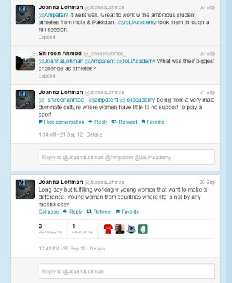The United States State Department has an Sports Exchange program called "Sports United" under the umbrella of the Bureau of Educational and Cultural Affairs. This program hosts athlete delegations from various countries and sends US athletes to other countries to learn about culture and philanthropy through sport. Sports United encompasses fair play principles to build bridges and empower youth.From September 11-22, 2012 it hosted 18 young women and two coaches from India and Pakistan.The ten-day program offered opportunities for the athletes and coaches to speak with sports management and offers conflict-resolution workshops. These young women gained access to young athletes, nutritionists and sports professionals during this exchange. They were provided with a tour of ESPN studios in Washington, DC for a tutorial in Sports Media. They met with State Dept Rep James Moore (Deputy Assistant for Public Diplomacy in the Bureau of South and Central Asia) to discuss their challenges, obstacles and share ideas and provide encouragement for one another.