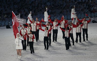 Kelime Cetinkaya of Turkey carries the flag during the Opening Ceremony of the 2010 Vancouver Winter Olympics at BC Place on February 12, 2010 in Vancouver, Canada.(February 11, 2010 - Photo by Matthew Stockman/Getty Images North America)