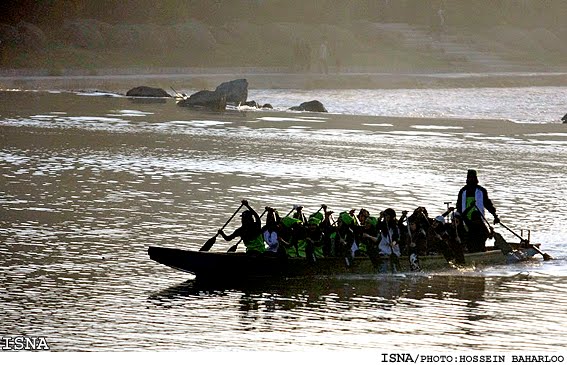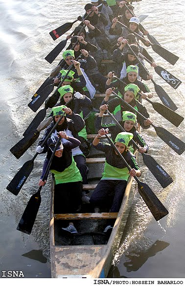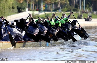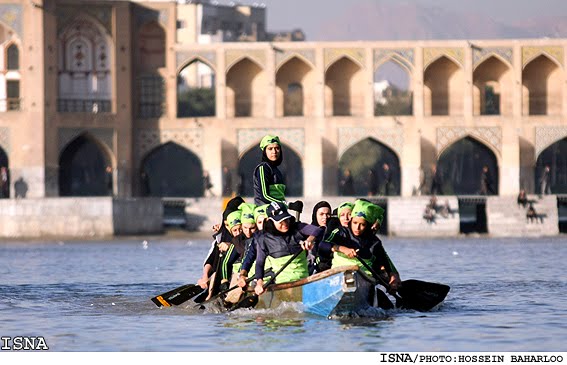 Following photos by Hossein Baharloo show the women rowing team practicing on the beautiful Zayandeh Rud river in the historic city of Isfahan in the shadows of the ancient Sio-seh-pol bridge.