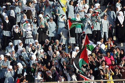The 22 women making up both teams marched onto the field wearing hijabs, the traditional head covering for Muslim women, and were greeted by an enthusiastic, roaring crowd, made up of tens of thousands of Palestinian women.