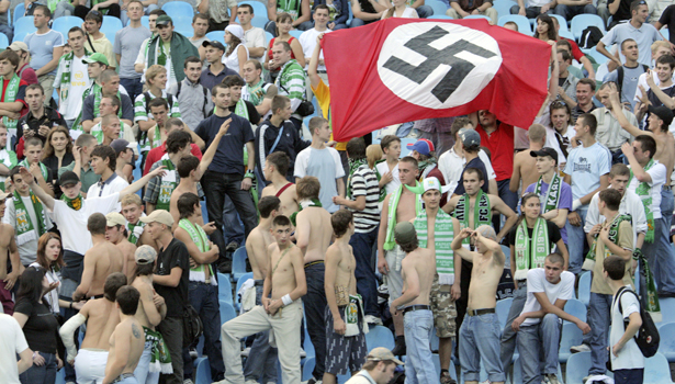 The full 30-minute report is full of shocking moments. In Ukraine, there's one scene showing fans making monkey sounds at black players. There's also one where a white supremacist group admits it embraces "some aspects" of Nazism, like getting rid of non-Ukrainians. The group also happens to train its members in knife fighting. Polish slogans include "Jews to the gas" or "death to the hooknoses."