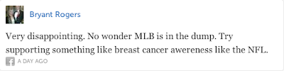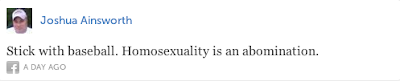 The last tweet, "Why bring gayness into it" is about as naive as they get. Gayness wasn't brought into baseball like one brings a bean salad to a dinner party. Where there have been people, there have been gays. Whether you acknowledge their existence or not is a completely separate issue. And what does it mean when one does "not hate gays, just hate their lifestyle"? If I said, I don't hate black people, I just hate their lifestyle I'm pretty sure I would still be hating black people (which, I don't - FYI). Is not your lifestyle part of your identity? Isn't your identity who you are? Also, in response to Jason Bonner's tweet, I'm glad you do not force your religious beliefs on anyone but supporting the LGBTQ community is not accepting immorality, rather it is an acknowledgement of human rights. Those little rights that enable you to go to church and wear a cross without persecution are the same rights that enable gays to be recognized as equal members of society.