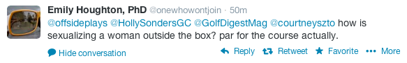 In 2013, Golf Digest featured 14 men on the cover of their magazine and two women. The May issue featured Holly Sonders for the inaugural GolFit issue. Sonders is an anchor for the Golf Channel and a very attractive woman. The only other woman who graced the cover was Kate Upton (WTF!) as arm candy for Arnold Palmer (face palm). According to USA Today the last female golfer to make the cover was in…make sure you are sitting…2008!!! Sonders commented on the Golf Channel that we should be applauding Golf Digest for "thinking outside of the box" by trying to draw more people to the game. Thinking out side of the box? Really? What box has she been living in? The box I have been living in sexualizes women as marketing plans A, B and C. Or as Dr. Houghton replied to me on Twitter