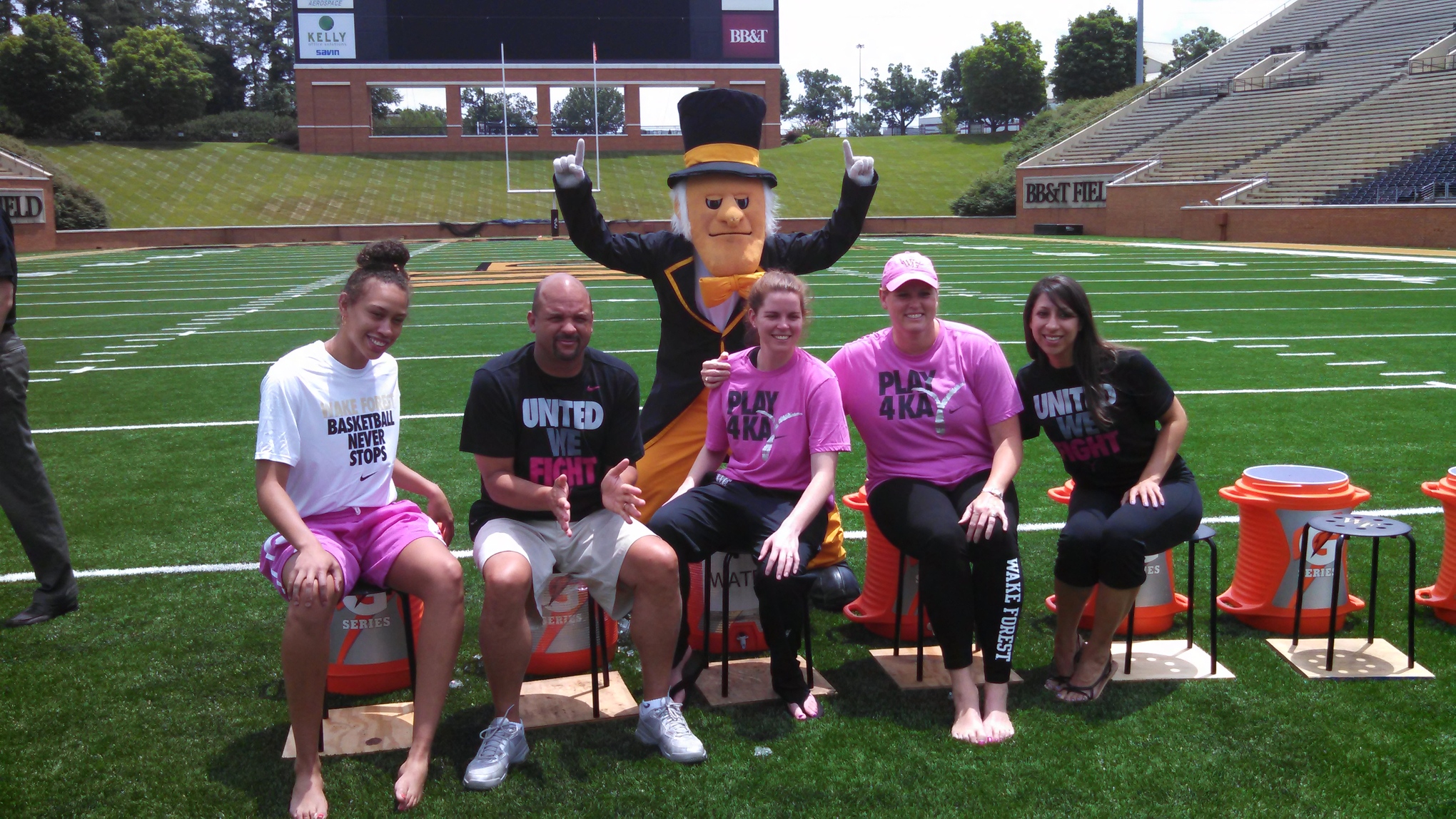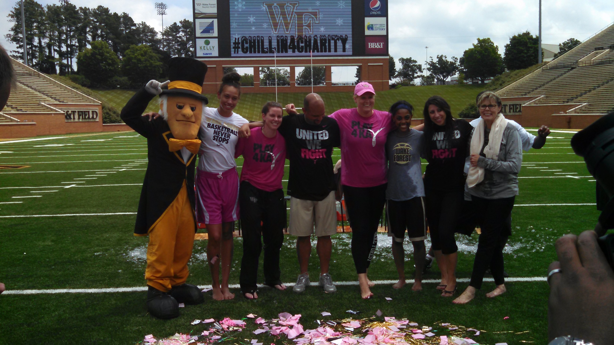 WINSTON-SALEM - The Wake Forest women's basketball team took its turn Monday in the "Chillin4Charity" campaign currently sweeping the country, staging their version of the popular event at BB&T;Field. Head coach Jen Hoover, surrounded by her staff along with players Dearica Hamby and Mykia Jones, were each doused by a cooler full of an ice-cold sports drink after calling out colleagues and former teammates to participate in the charity initiative.