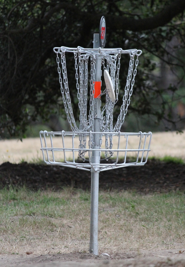 Before I continue to rant about how people have never heard of Disc Golf, let me stop and explain what “Disc Golf” actually is. Disc Golf is a sport played much like golf (or as we say, “Ball Golf”), in that we are playing from a teeing area and want to use our equipment and reach the target in the least amount of strokes. Our equipment includes our choice of aerodynamic Frisbee-like discs and our target is an elevated metal basket with hanging chains (to stop the disc from flying and drop into the basket). Here’s a picture to explain my loaded sentences.