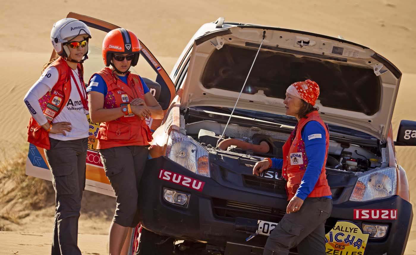 March 28, 2013 (Foumz Zguid, Morocco) - Fierce competition was in the air during the final leg of the 2013 Rallye Aïcha des Gazelles. The two day Marathon Leg consisted of the famous Chegaga dunes, navigation challenges for even the most experienced teams and a surprising twist with the two top contenders suffering mechanical failures. The teams called in for mechanical assistance resulting in a 200 penalty point each and an instant shake up in the top ten standings.