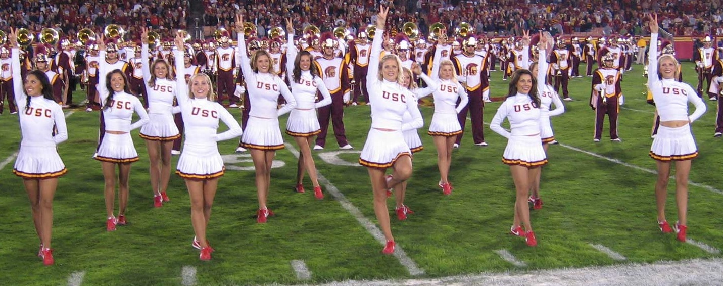 Right on the cusp of too revealing for college cheerleaders (the tops are tight but not too tight; the skirts are short but too much so), the classic long sleeves and solid white with garnet and gold trim have become the trademark of the USC Song Girls, having graced the sidelines for decades without undue change or getting slutty. The founder of the Song Girls, Bothwell Lindley, summed it all up with a quote: "Have pride without arrogance and confidence without conceit." Sounds like good fashion advice to me.