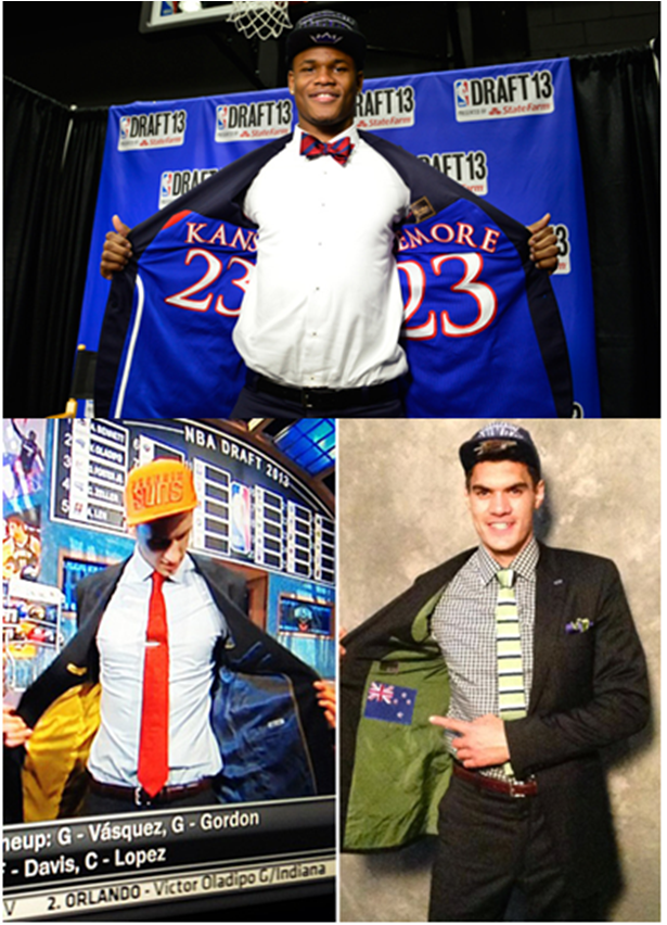 The NBA Draft typically serves as a forum for up-and-coming players to prove that they can keep pace in the league’s style game. The 2013 NBA draftees took the custom clothing concept to a whole new level. Jacket linings were decorated with personal touches, from country flags to alma mater shout-outs. Among the standout style statements was Ben McLemore’s jacket interior, which featured a deconstructed Kansas jersey. The look was created by custom clothing company, Elevee.