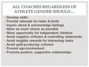 Male and female athletes are much more similar than they are different. There is just as much variability within females and within males, than between males and females. Despite the popular Mars/Venus perspective that females and males are vastly and inherently different, psychological research has not proven this true (see APA keynote from Janet Hyde titled “The Gender Similarity Hypothesis”). Similarly, despite widespread opinions, anecdotes, quotes from famous coaches (i.e. Anson Dorrance), and popular press “coaching girls” books that are not evidence-based, research in coaching science and sport psychology does not support the idea that coaching males and females is different.