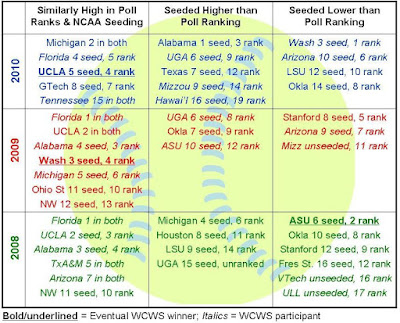 Though we obviously have a small sample, it seems that of the two, poll rankings may be a better indicator of likely tournament success than the seedings. Most notably, the 2008 Arizona State squad that won the Women's College World Series was ranked No. 2 in the poll, but only seeded sixth. That same year, Virginia Tech, which made a surprise appearance in the WCWS, had a poll ranking of 16th (potentially warranting a No. 16 seed), but was unseeded. Louisiana-Lafayette, another surprise 2008 WCWS participant, was ranked 17th, but unseeded.