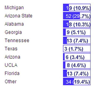 Arizona State, No. 1 in the NCAA seeding and in the media/coaches polls, came in first in our reader poll, garnering nearly 30% of the 175 votes cast. Second place was "Other," with nearly 20% of the vote. I have no way of knowing for sure which specific teams voters were thinking of when they selected "Other." Likely candidates would seem to be Missouri (No. 5 seed) and Cal (No. 7 seed). Michigan and Alabama were the only other teams to receive at least 10% of readers' votes.