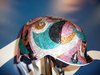 So by now we all know wearing a helmet is a wise thing to do. (Read my earlier post on helmet use). California even toyed with a law to mandate its resorts to require it, but Gov. Schwarzenegger vetoed the legislation, saying it would place an unnecessary burden on resort operators without any assurance of fewer injuries and fatalities. Nevertheless, it just makes sense to protect your head. So why not make a statement while doing it - a brilliant one. Check out these high-style helmets handcrafted by Dareece Saca for Ice Couture.