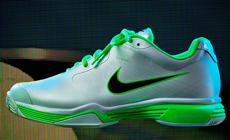Sharapova hit the court wearing the Nike Maria Statement Slam Dress in white and neon green featuring high impact built-in bra and unique details like slits with contrast mesh underlay on sides and back. Also from her collection, Sharapova wears a pair of Lunar Speed 3 lowtops.