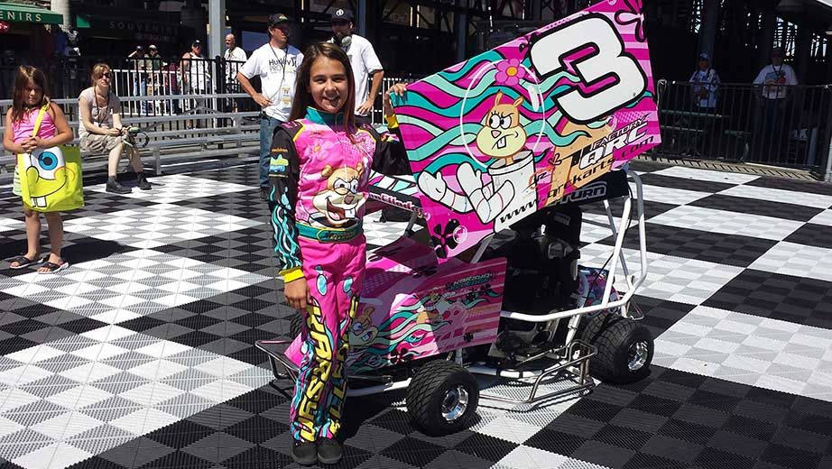 Wearing a bright pink SpongeBob SquarePants driving suit, Karsyn stood in the Sonoma Raceway Winner’s Circle and proudly unveiled the new No. 3 Nickelodeon-sponsored pink Mini Outlaw sprint car she’ll use barnstorming the West Coast for her summer vacation. The young driver has a dozen races lined up in California, Oregon and Washington.