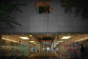 It was impossible to miss pilgrimage to the Apple Store on North Michigan Ave. with it’s growing shrine of colored, handwritten post-its, flowers, candles (and, of course, apples) – juxtaposed against the running-shoe clad marathon throngs (45,000 runners!) prepping for their personal journeys.