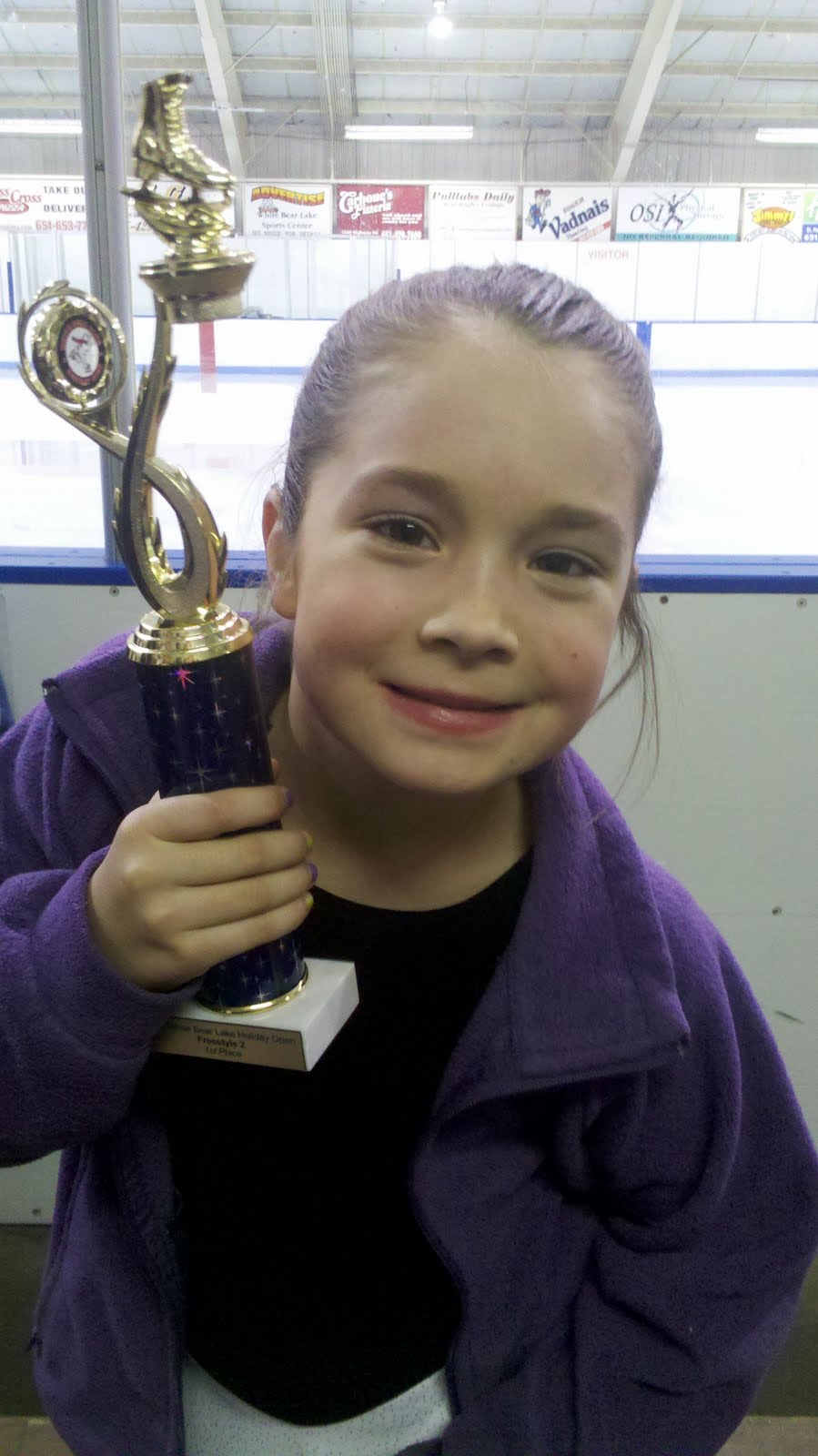 This weekend I competed in a figure skating competition in White Bear Lake. I took first place in my event. Since I started skating three years ago I have won 10 medals and trophies.