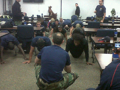 All the speeches and videos we watched when we arrived had me pumped up and eager to face what we had in store for the day. But before we even got outside to get started, we had pushups. That’s when I knew we were in trouble. My arms were shaking before we even did one. We all got down in pushup position and then he started in on a monologue that wouldn’t end. No knees allowed…back has to stay straight…and finally we had to start…then stop…then start…then start from the beginning because we weren’t in unison…and finally, “recover”. Now we can get started. The sad part was my arms already felt like jello.