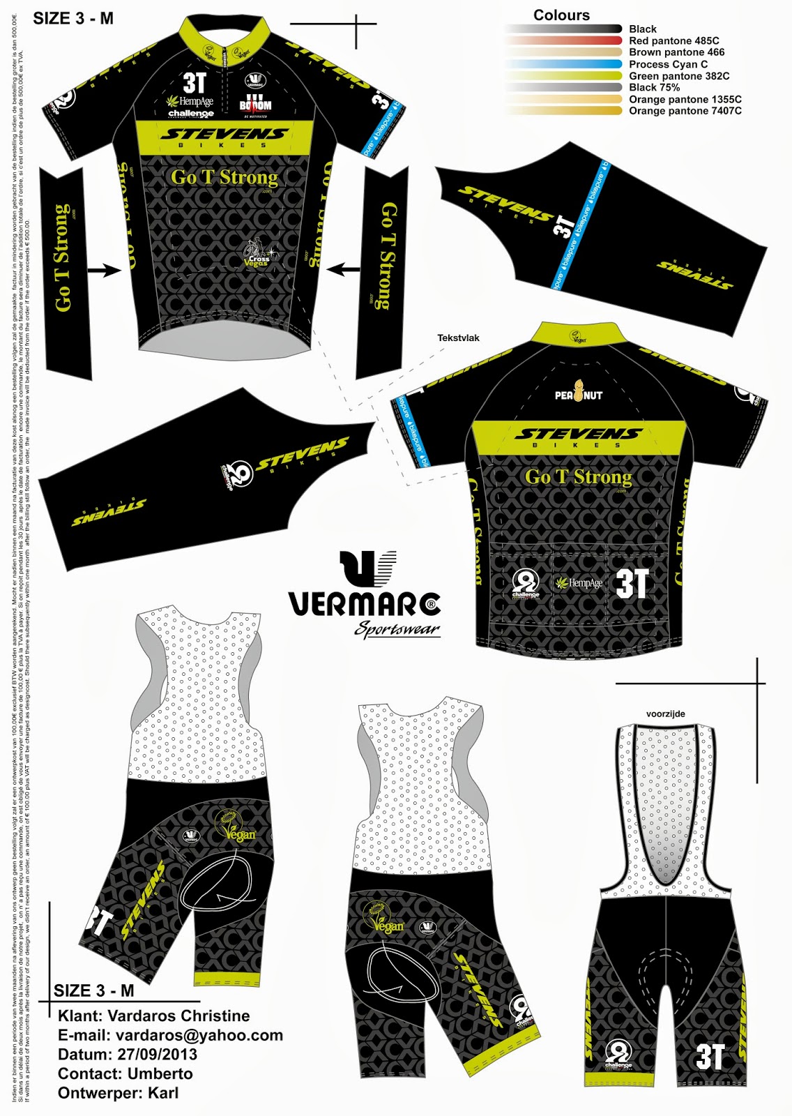 my new kit This year around, I started my own team. My sponsors are STEVENS Bikes, Go-T-Strong (a super cool "green" transportation company out of Texas), HempAge (casual clothing), Challenge Tires, 3T Cycling (wheels, cockpit), BOOOM (energy bars/gels/drink), Vermarc, CrossVegas, SHEEX (performance bedsheets and pajamas), Tam Bikes out of Mill Valley, and Specialized (helmets, shoes, gloves). I also added a bike pure arm band on the jersey as well as the official Vegan logo on my collar and ass. It feels GREAT to be able to once again hand pick my sponsors who parallel my beliefs. Unfortunately my new clothing isn't ready yet, so until then i will be sporting the STEVENS factory skinsuit.