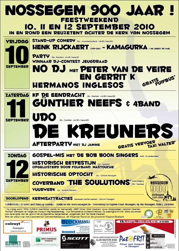 This weekend will be a full one for me. Friday is my next race, then it's back home for a nap and out the door to the first of three party days in celebration of Nossegem's 900 year birthday. This town is 5km from us and is where Jonas grew up. Friday is the full-blown party, Saturday is a couple of concerts - one of Jonas' friends named UDO is performing, followed by one of my favorite belgian bands DE KREUNERS. And on Sunday they are holding more parties, a tour of the town, and a parade where i get to heckle a few of my friends participating in it.