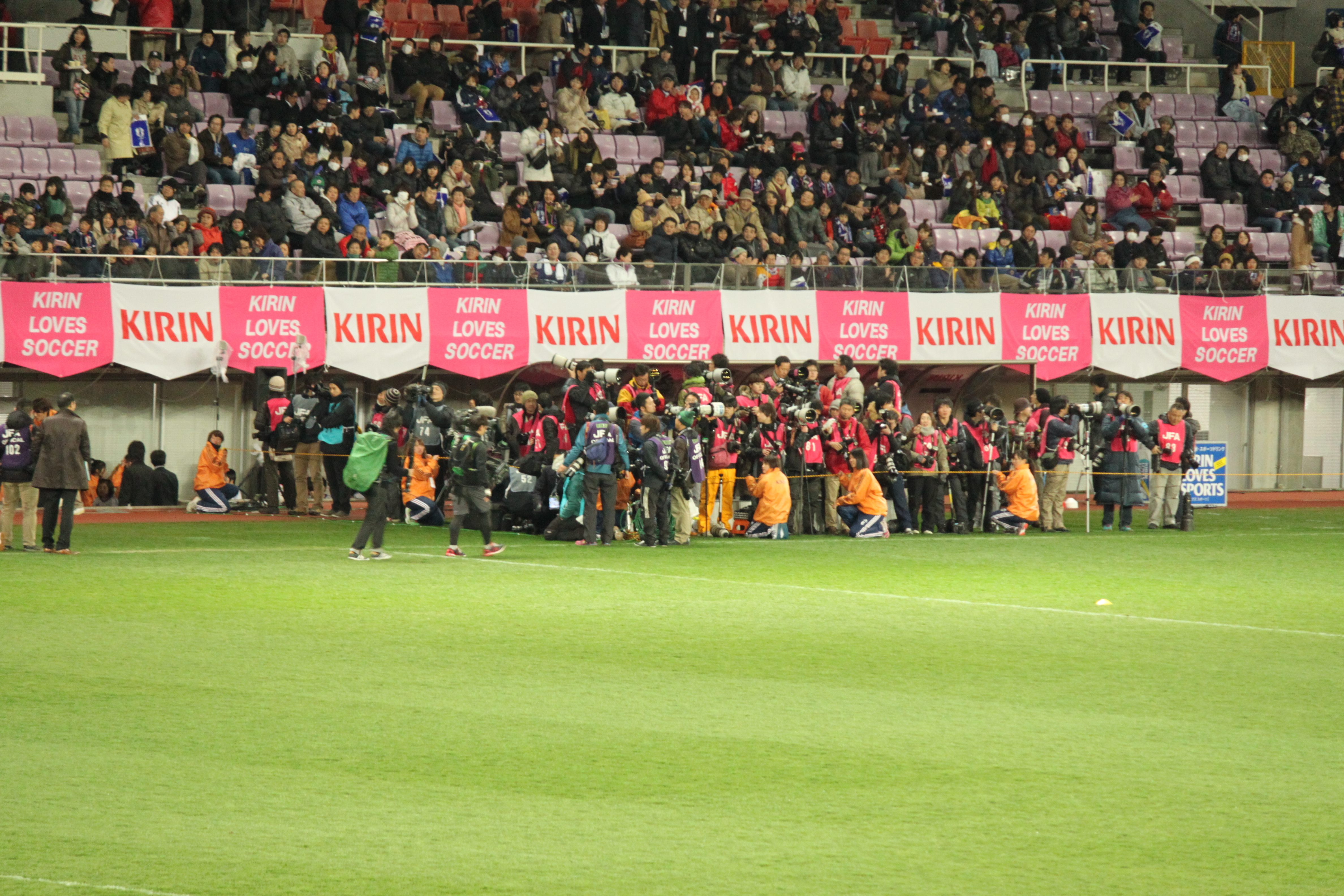 This is to say nothing of the journalists encircling the pitch, the Japan Air Self-Defense Forces marching band warming up near the bench, or the souvenir stands emptied of the newly-released Nadeshiko Japan scarves by half-time. The fitting cap on the evening, of course, were the over 15,000 spectators–many of whom had begun lining up hours before the gates even opened–singing, screaming, and chanting “Mi-Ya-Ma, Mi-Ya-Ma” before each corner. In fact, save for a complete sell-out and Dan Borislow being shipped over freight class to take a Miyama free kick to the groin, few dreams weren’t at least fleetingly glimpsed on Sunday.