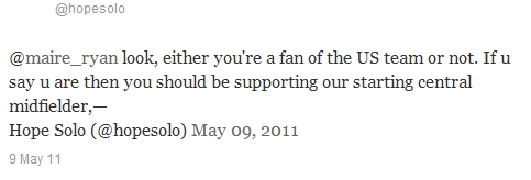 By now it would be pointless to rehash the controversy Solo sparked with her twitter comments regarding Chastain’s on-air commentary (and I swear, this will be the first and final word on this). If you’re legitimately in the dark, just run the search term ‘Hope Solo’ through Google News.