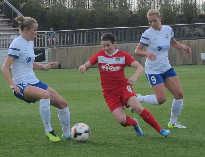 That of course raised expectations for the rest of the homestand – maybe 9 points weren’t out of reach. At halftime of the Sky Blue match, those hopes seemed to be in the process of being fulfilled. Despite being largely outplayed by the visitors – “the best half of soccer we’ve played this year,” said Sky Blue head coach Jim Gabarra – they went into the locker room with a 1-0 lead thanks to a terrific goal by Robyn Gayle, who given a feed by Crystal Dunn – now the right flank defender instead of Sierra – managed to maneuver to find room in a crowd and fire the ball in.