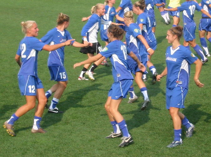 Ali Andrzejewski (far left) and Katie Watson (far right) when they were playing for the 2007 W-League Champion Washington Freedom.