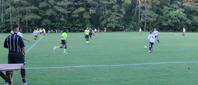 Chesapeake continues to roll, albeit with their characteristic difficulties in scoring early. On Wednesday night on their home field at Arundel High, they took on the Lion Soccer Club, the southern Maryland team that last year went 0-9-0 with a -57 goal differential. You’d think the rout would be on from the opening whistle, but instead the Charge seemed to come up with every possible way not to score. Shots went high, wide, off the crossbar, off the post, or were saved by goalkeeper Paige Gray, who did some excellent work to keep the ball out of the net. Crosses were behind the runner, too far in front of the runner, or right at the runner so that she tripped over the ball. When the first-half whistle blew, the score remained 0-0.