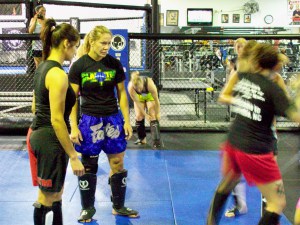 The day started out with Strikeforce champion Cyborg Santos teaching striking at the Wand Fight Team gym. Fighter Kim Couture assisted in what was an intensive warm-up to the day.