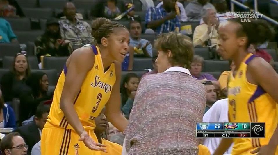 At the end of the first quarter of play in last night's Lynx at Sparks game, Candace Parker reacted to something assistant coach Gail Goestenkors said. Later, in the second quarter, the injured Candice Wiggins came off the bench to speak to her teammates.