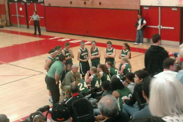 Edison Coach Dan Wiley conducts a timeout. The Samuelson sisters are #44 Karlie and #41 Bonnie.